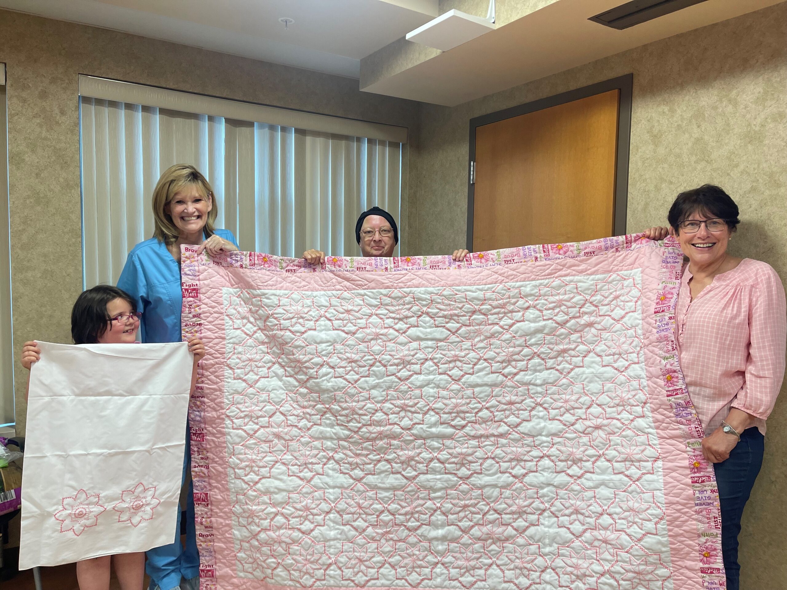 A beautiful twin size quilt with matching embroidered pillow cases, made by Louise Shiflett.